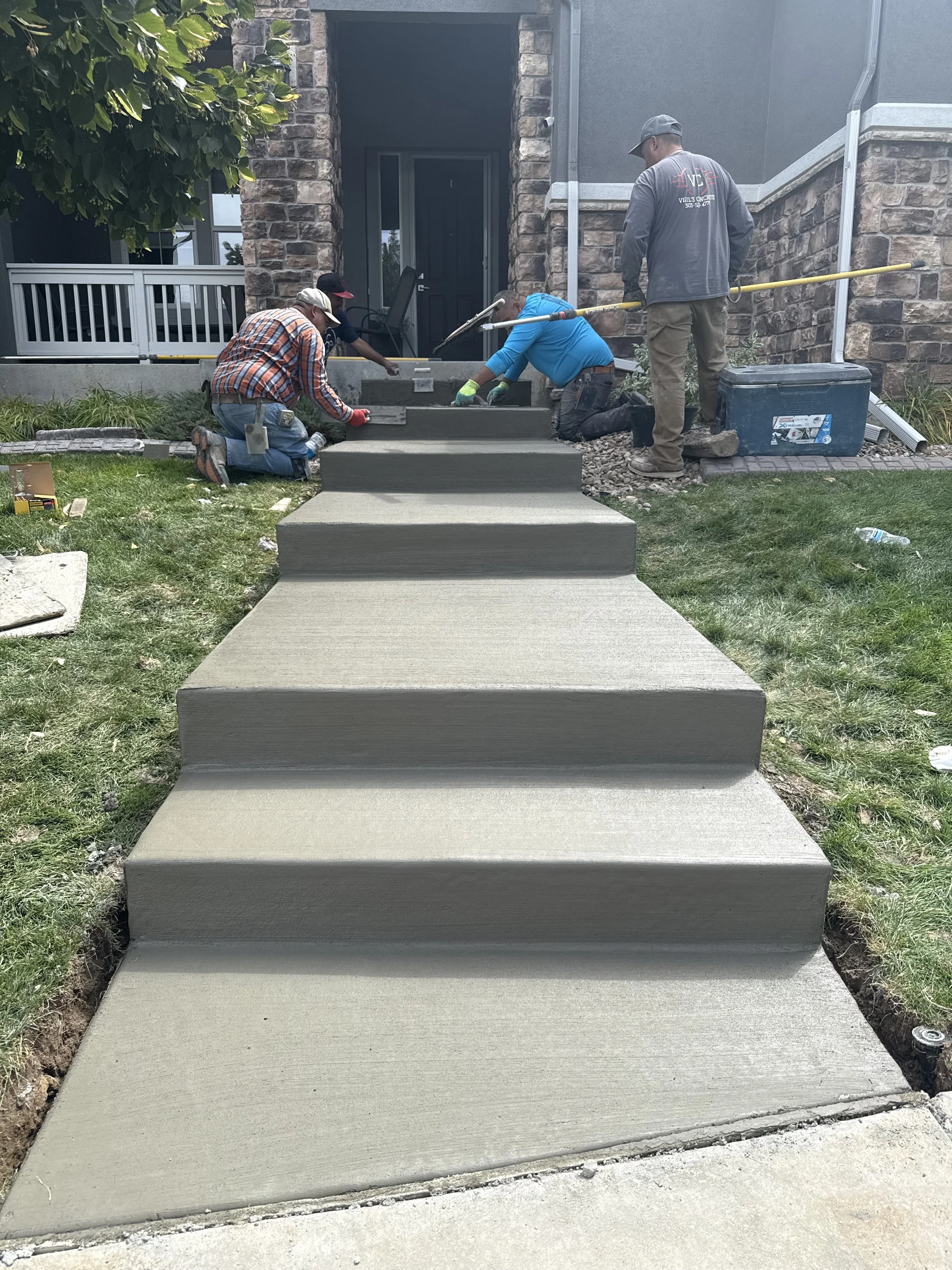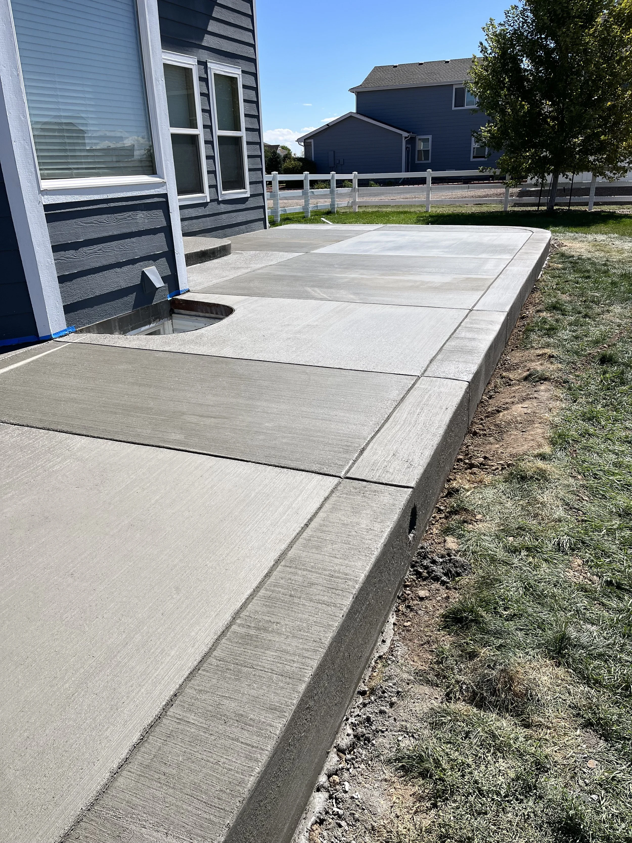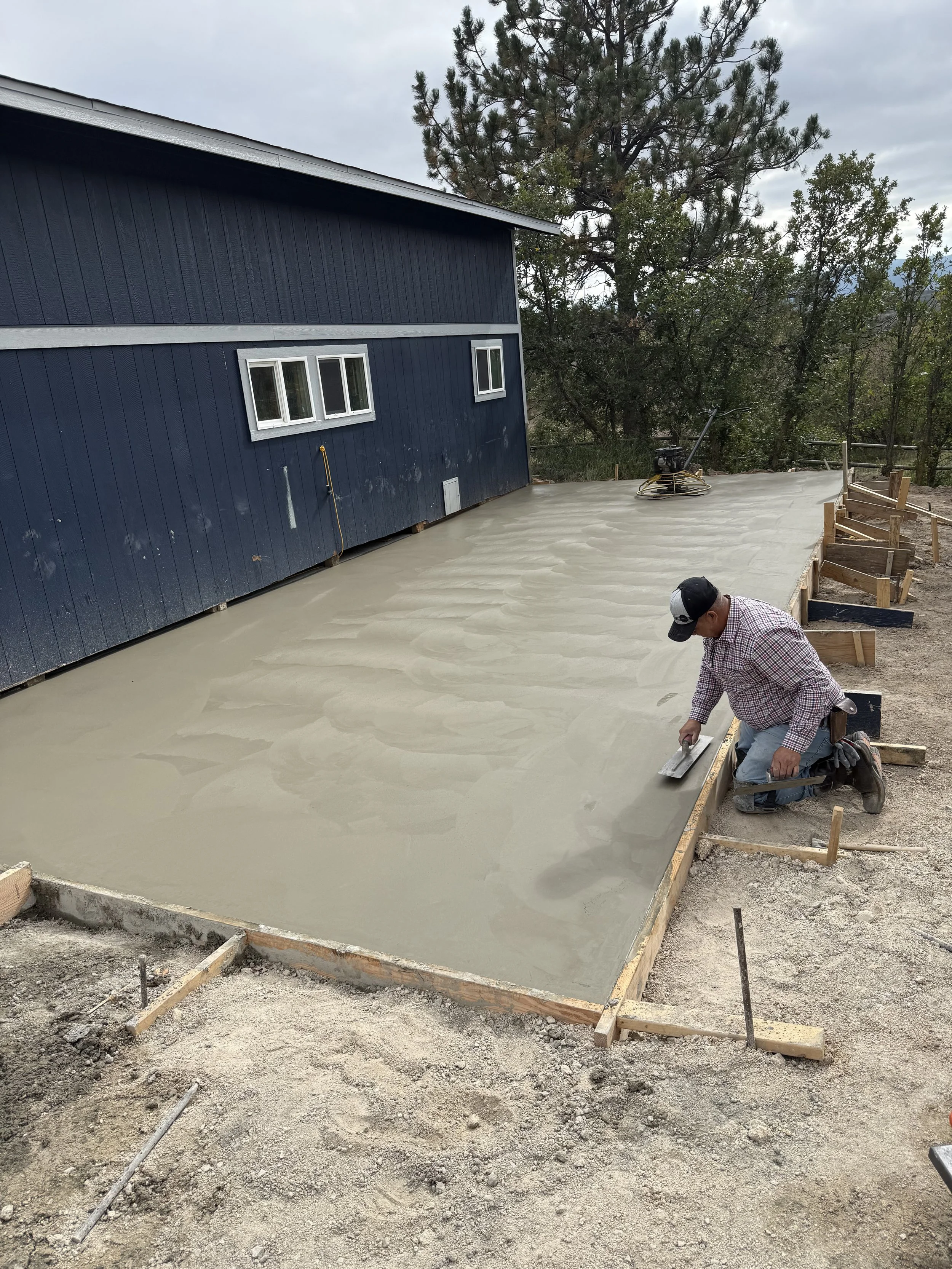 Our slabs are typically poured at 4–6 inches thick, reinforced with #3 or #4 rebar on a 24-inch on-center grid (as specified per scope). Each pour is set over a properly compacted base with control joints spaced every 8–12 feet to manage cracking and ensure structural integrity. We design for proper drainage slope and use a minimum 4,000 PSI concrete mix for strength and durability. For added protection and long-term surface performance, we also offer a cure-and-seal application on all newly poured slabs.